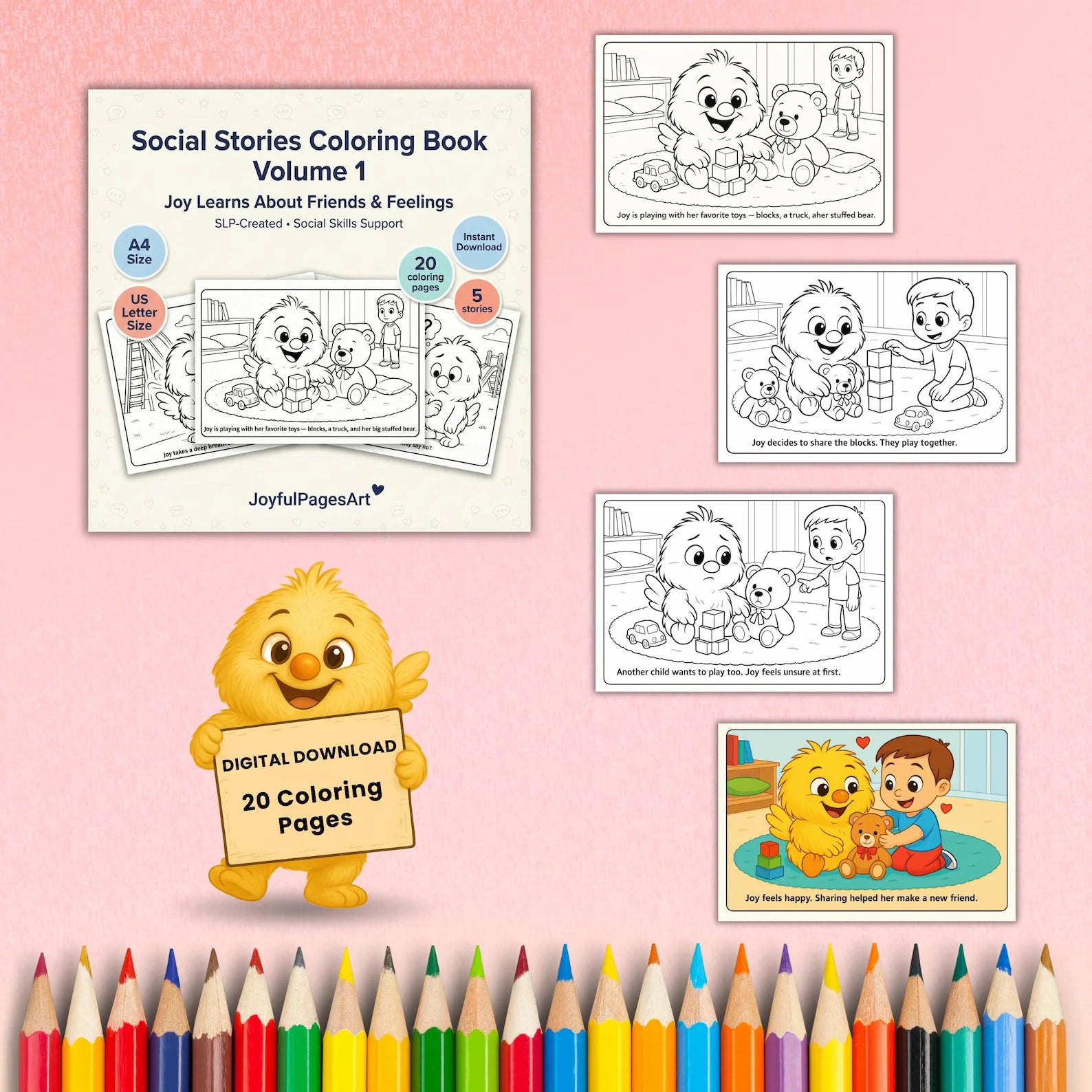 Teach core social skills through short, visual stories kids can read, color, discuss, and repeat. Each page includes simple on-page captions to guide understanding and make practice consistent across home, school, and therapy.